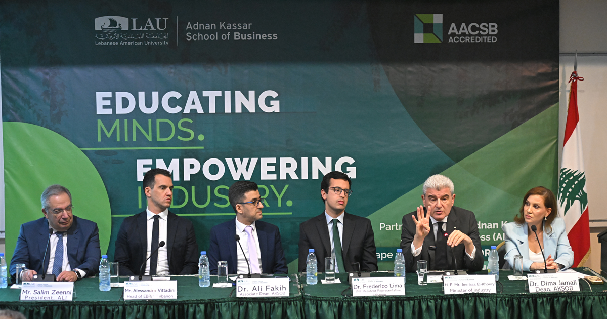 استضافت كلية عدنان القصار لادارة الاعمال في الجامعة اللبنانية الاميركية (LAU) وضمن سلسلة الندوات والحلقات التي تنظمها، ندوة بعنوان: ”الابتكار والاستدامة ومستقبل الصناعة“ بحضور ومشاركة وزير الصناعة جو عيسى الخوري، الممثل المقيم لصندوق النقد الدولي في لبنان (IMF) فردريكو ليما، ممثل البنك الاوروبي لإعادة الاعمار والتنمية في لبنان (EBRD)اليساندرو فيتاديني، رئيس جمعية الصناعيين اللبنانيين سليم زعني، وتولت ادارة الندوة عميدة الكلية الدكتورة ديما جمالي، وشاركها العميد المشارك للكلية والاستاذ في الاقتصاد الدكتور علي فقيه وحشد من الاساتذة والطلاب والمهتمين بملف الصناعة اللبنانية.