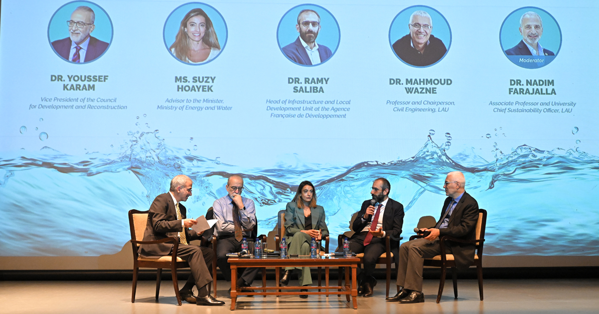 وكانت كلمات للدكتور يوسف البر كرم نائب رئيس مجلس الانماء والاعمار الذي تركزت مقاربته على موضوع الصرف الصحي، والجوانب الإدارية والفنية لهذا القطاع في لبنان، والمشاريع المنفذة والتحديات التي واجهتها. والقت مستشارة وزير الطاقة والمياه سوزي حويك كلمة عرضت فيها لأزمة المياه. ثم عقدت جلسة حوار شارك فيها الى جانب كرم وحويك، الدكتور رامي صليبا ممثل الوكالة الفرنسية للتنمية والدكتور محمود وزني استاذ الهندسة المدنية والرئيس المشارك في كلية الهندسة في (LAU)، وادار النقاش، الدكتور نديم فرجالله الاستاذ المشارك ورئيس مكتب الاستدامة في الجامعة اللبنانية الاميركية.