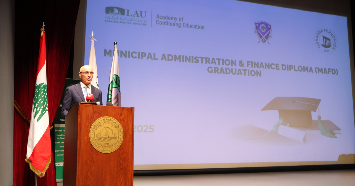 احتفلت ”اكاديمية التعليم المستمر (LAUACE)“ في الجامعة اللبنانية الاميركية مع ”مؤسسة مهنا“ ووزارة الداخلية والبلديات بتخريج دفعتين من الطلاب والطالبات ممن أنهوا دراسة دبلوم في إدارة الشؤون المالية البلدية، وهم من بلديات مختلفة على امتداد الاراضي اللبنانية، ويشكلون الدفعة الـ 12 من بين 500 طالب وطالبة تخصصوا في علوم الادارة البلدية والتنمية المحلية في الجامعة، ما يشكل خطوة متقدمة على طريق إصلاح القطاع العام في لبنان على مستوى التواصل اليومي والتفاعل مع المواطنين عبر البلديات.